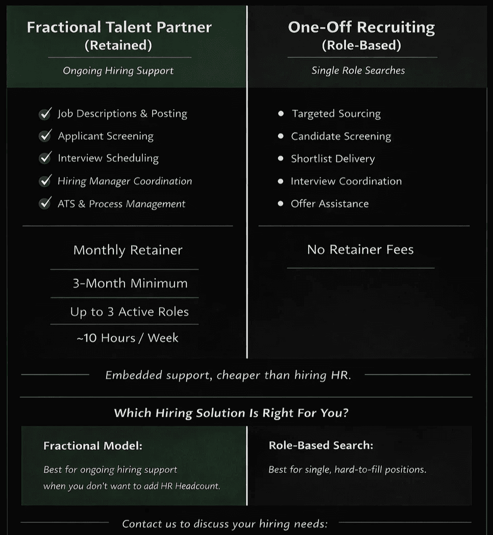 We help startups and small teams run their hiring process without adding full-time HR. From job descriptions to interview scheduling, we handle the operational side so your team can focus on growth..